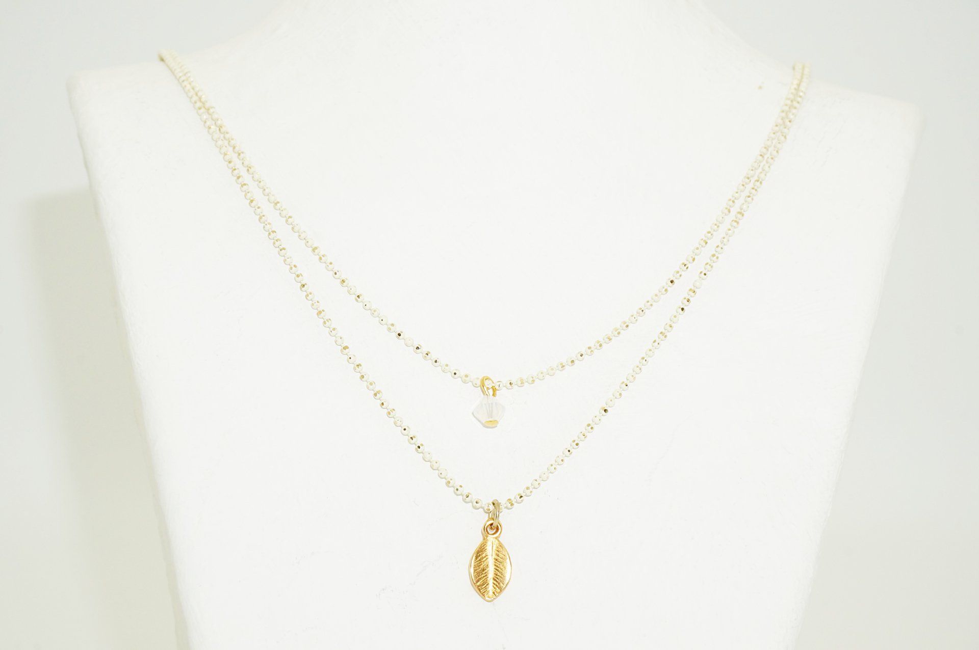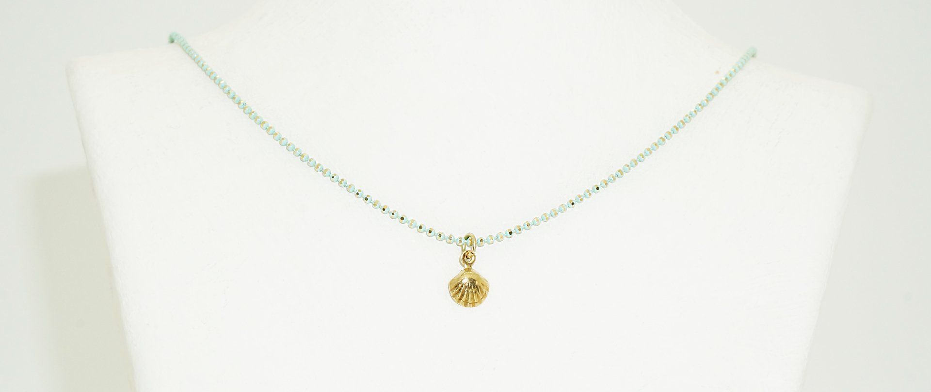 Vergoldete Messingkette mit kleinen Glasperlen, Länge insgesamt bis ca. 43,5 cm. Ebenfalls halsumspielend, federleicht und total bezaubernd. Mit vergoldetem Messinganhänger (Muschel oder Blatt) und kleiner Glasperle: