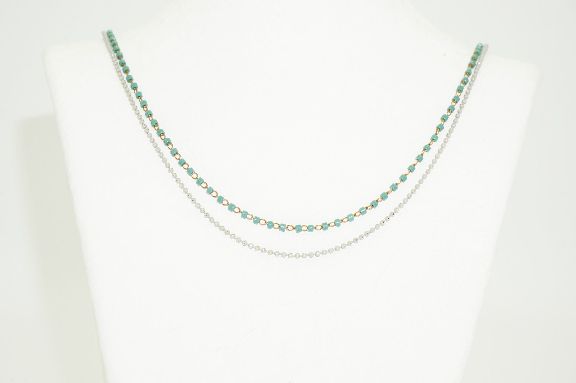 Unsere filigranen Doppel-Ketten sind mit Verlängerung und Karabiner ca. 43,5 cm lang. Sie sind angenehm leicht und fallen am Dekolleté schön rund. Es handelt sich um vergoldete Messingketten, teils mit japanischen Miyuki Perlen, teils mit Glasperlen, sowie um gefärbte Messing-Kugelketten, die je nach Farbe einen leichten Glanz aufweisen oder matt sind: