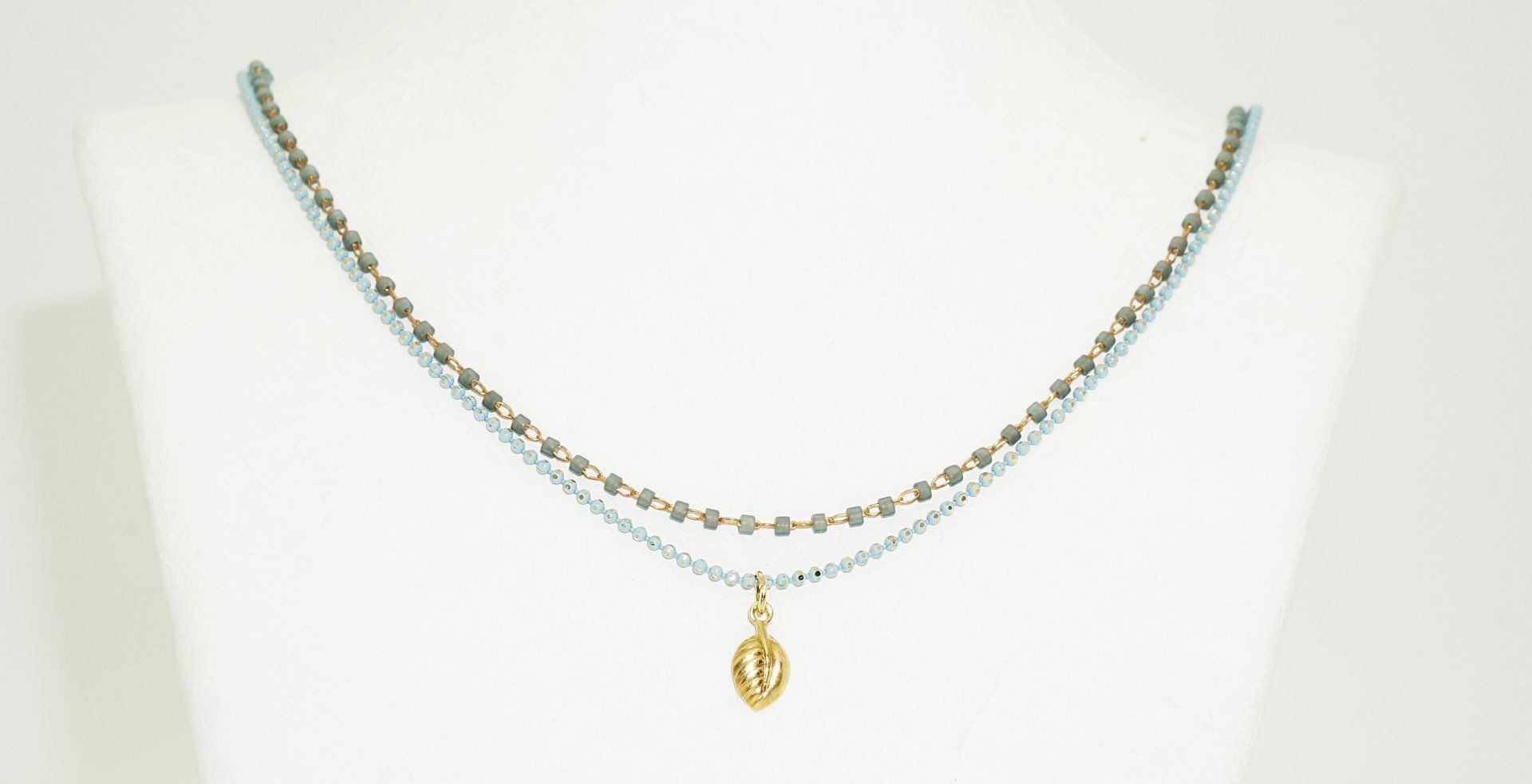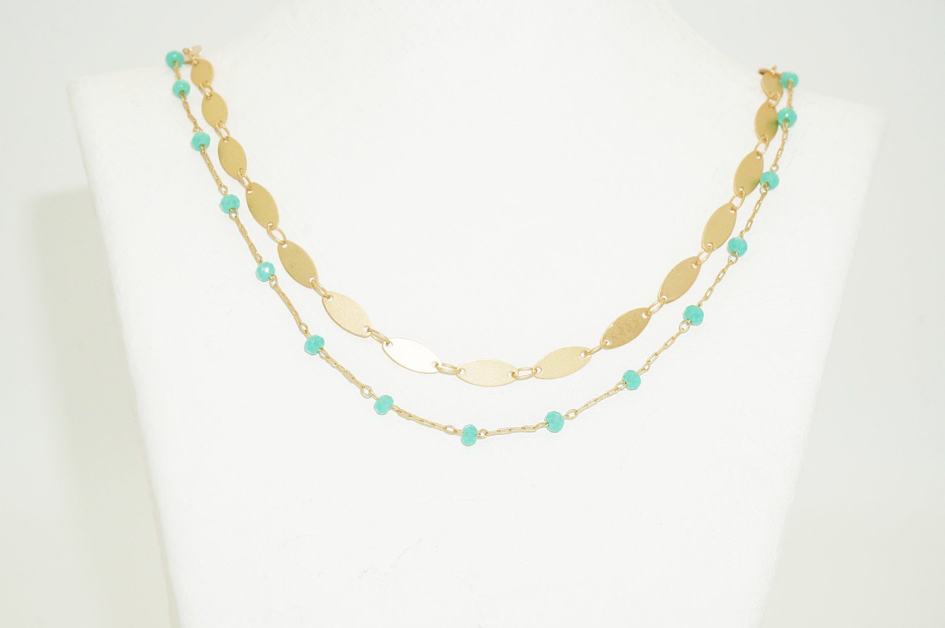 Zweireihige Kette mit vergoldeter Messing-Navettekette und Glasperlenkette, Länge ca. 43 cm. Auch in flieder, orange und rot und jeweils auch als einzelne Kette erhältlich: